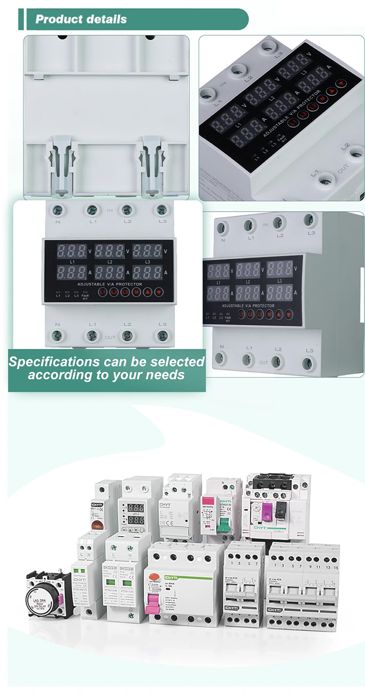CHVP 4 पोल थ्री फेज भोल्टेज प्रोटेक्टर रिले एकल-फेज AC नेटवर्कहरूका लागि विद्युतीय उपकरणहरूलाई सर्ज भोल्टेजबाट जोगाउन माइक्रोप्रोसेसर-आधारित भोल्टेज निगरानी यन्त्र हो। यन्त्रले मुख्य भोल्टेजको विश्लेषण गर्छ र डिजिटल सूचकमा यसको हालको मान देखाउँछ। लोड विद्युत चुम्बकीय रिले द्वारा स्विच गरिएको छ। प्रयोगकर्ताले बटन मार्फत हालको भोल्टेज मान र ढिलाइ समय सेट गर्न सक्छ। मान गैर-अस्थिर मेमोरीमा भण्डार गरिएको छ। जडानको लागि एल्युमिनियम तार र तामाको तारहरू प्रयोग गर्न सकिन्छ।